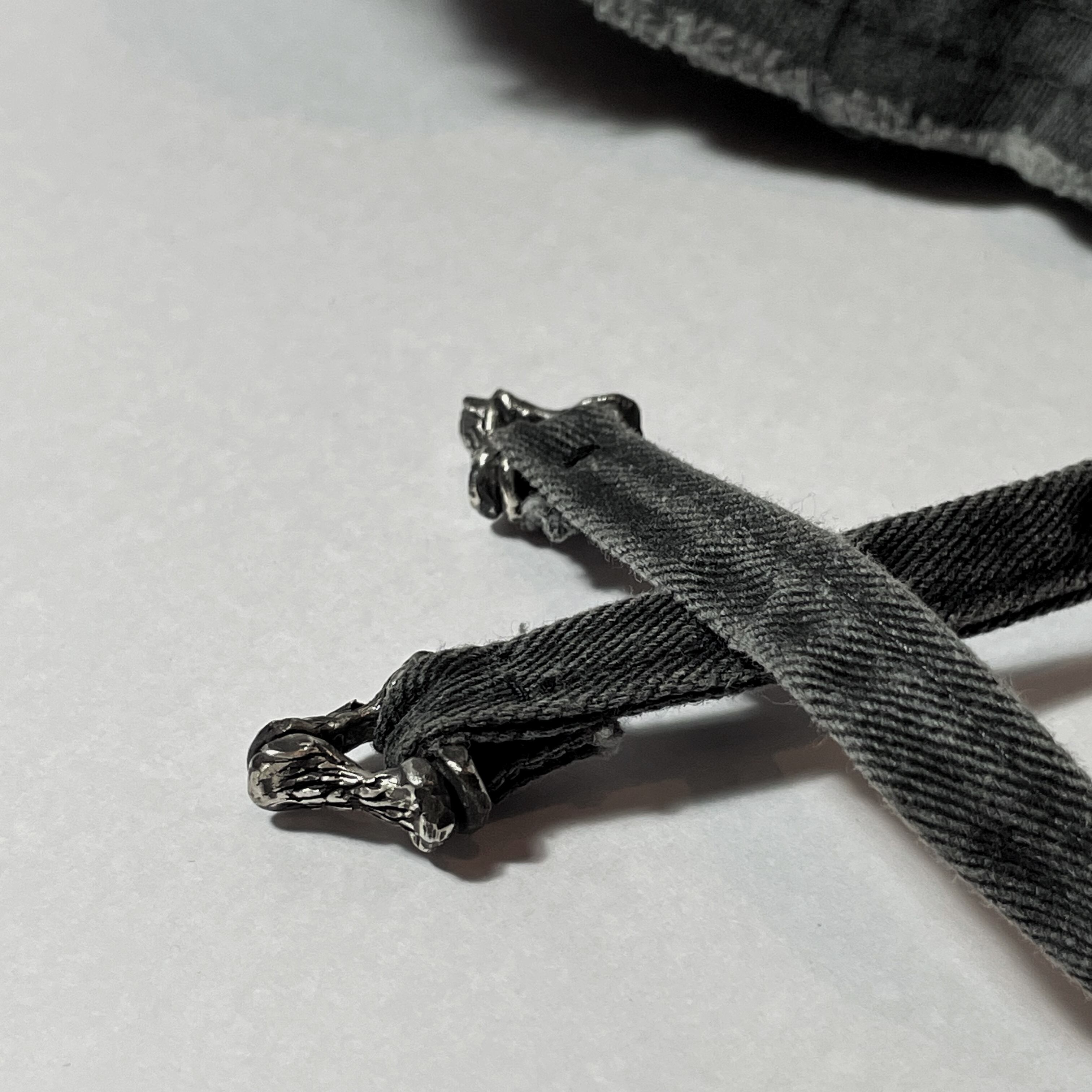 帽子から垂れるワンポイントの紐の先には骨をモチーフにしたトライアングルを付け、Lyの文字を刻印。